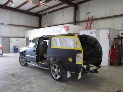 DURING: Hood Removed for Dent Repair, Blend Paint on Front Left Door and Left Quarter Panel, Replace Door